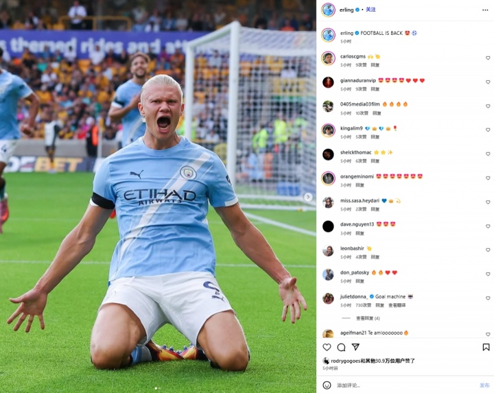 世俱杯买球APP-哈兰德更新社媒庆祝英超开门红,罗德里戈点赞