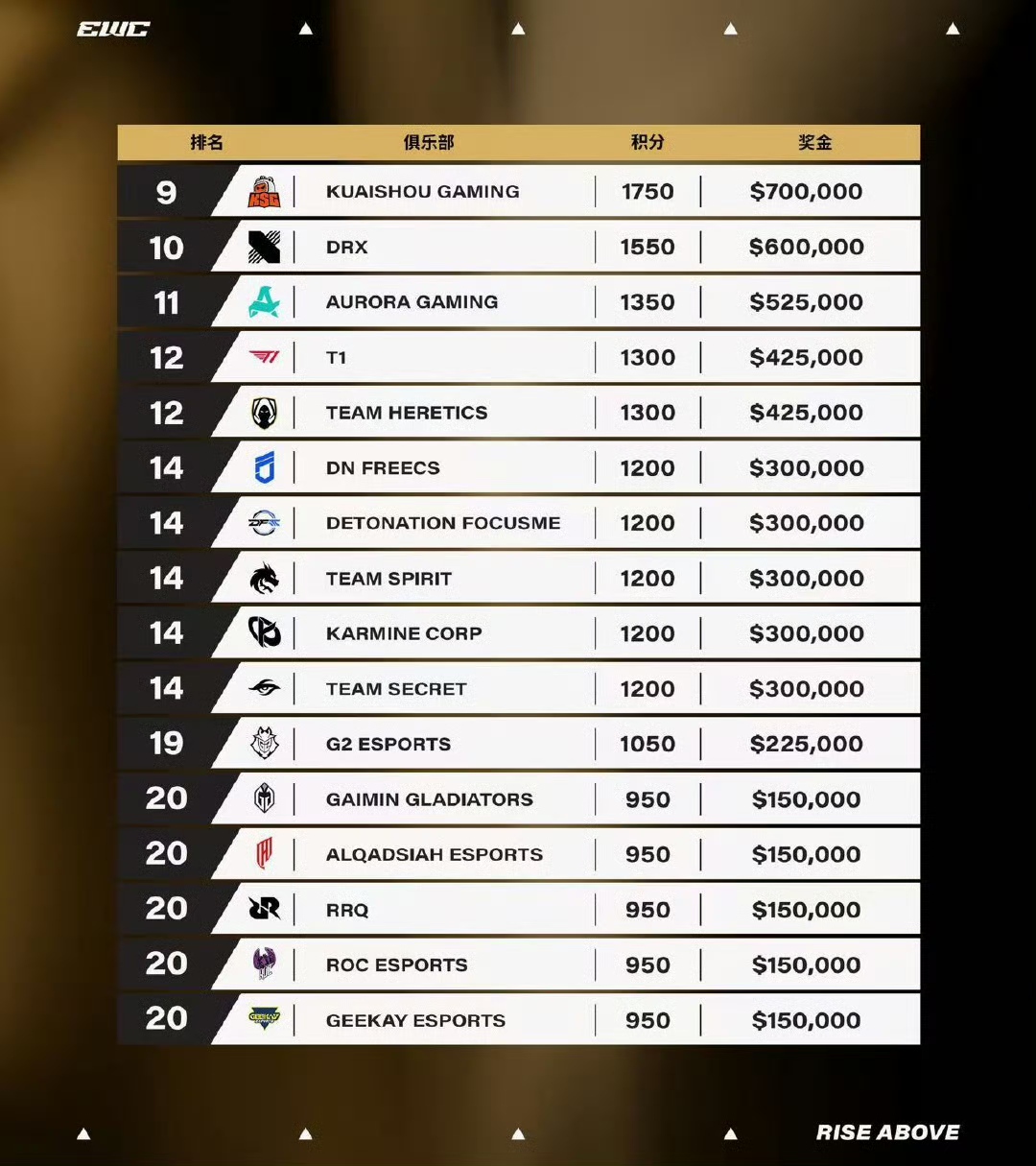 此外,三支中国俱乐部进入俱乐部锦标赛前十。其中,AG.AL积分3050,排名第六;Weibo Gaming(WBG),积分1950,排名第八;KuaiShou Gaming(KSG),积分1750,排名第九。